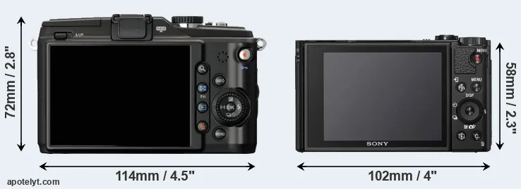 The side-by-side display below illustrates the physical size and weight of the Olympus E-PL2 and the Sony HX99. The two cameras are presented according to their relative size. Three successive views from the front, the top, and the rear are shown. All size dimensions are rounded to the nearest millimeter.