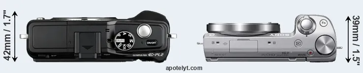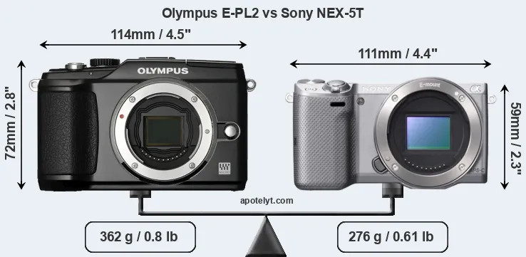 The physical size and weight of the Olympus E-PL2 and the Sony NEX-5T are illustrated in the side-by-side display below. The two cameras are presented according to their relative size. Three consecutive perspectives from the front, the top, and the back are available. All width, height and depth dimensions are rounded to the nearest millimeter.