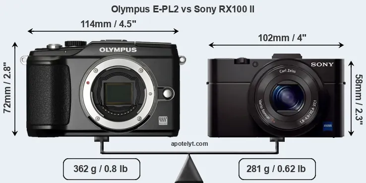 The side-by-side display below illustrates the physical size and weight of the Olympus E-PL2 and the Sony RX100 II. The two cameras are presented according to their relative size. Three successive views from the front, the top, and the rear are shown. All size dimensions are rounded to the nearest millimeter.