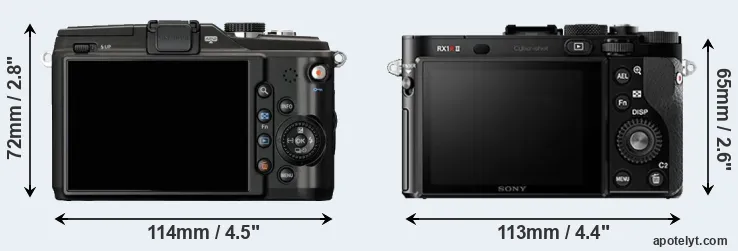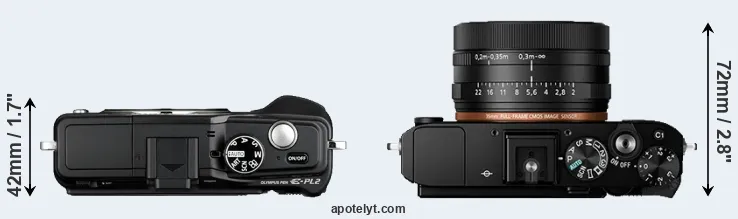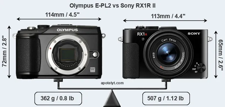 The above size and weight comparisons are to some extent incomplete and possibly misleading, as the RX1R II has a lens built in, whereas the E-PL2 is an interchangeable lens camera that requires a separate lens. Attaching the latter will add extra weight and bulk to the setup. You can compare the optics available for the E-PL2 and their specifications in the Micro Four Thirds Lens Catalog.