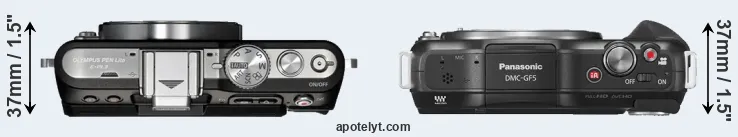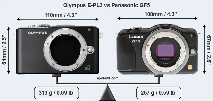 An illustration of the physical size and weight of the Olympus E-PL3 and the Panasonic GF5 is provided in the side-by-side display below. The two cameras are presented according to their relative size. Three successive views from the front, the top, and the rear are shown. All size dimensions are rounded to the nearest millimeter.