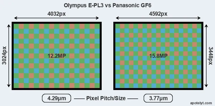 While the two cameras under review share the same sensor size, the GF6 offers a higher resolution of 15.8 megapixels, compared with 12.2 MP of the E-PL3. This megapixels advantage translates into a 14 percent gain in linear resolution. On the other hand, these sensor specs imply that the GF6 has a higher pixel density and a smaller size of the individual pixel (with a pixel pitch of 3.77μm versus 4.29μm for the E-PL3). However, it should be noted that the GF6 is a somewhat more recent model (by 1 year and 9 months) than the E-PL3, and its sensor might have benefitted from technological advances during this time that at least partly compensate for the smaller pixel size.