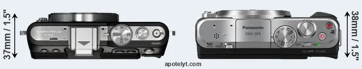 The physical size and weight of the Olympus E-PL3 and the Panasonic GF6 are illustrated in the side-by-side display below. The two cameras are presented according to their relative size. Three consecutive views from the front, the top, and the rear side are shown. All width, height and depth dimensions are rounded to the nearest millimeter.