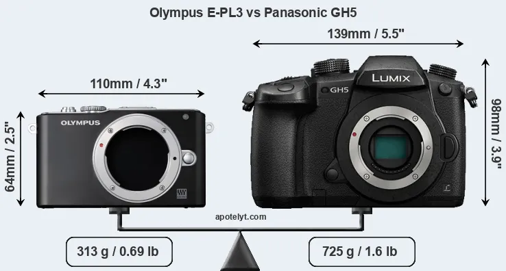 If the front view area (width x height) of the cameras is taken as an aggregate measure of their size, the Panasonic GH5 is considerably larger (93 percent) than the Olympus E-PL3. Moreover, the GH5 is substantially heavier (132 percent) than the E-PL3. It is noteworthy in this context that the GH5 is splash and dust-proof, while the E-PL3 does not feature any corresponding weather-sealing.