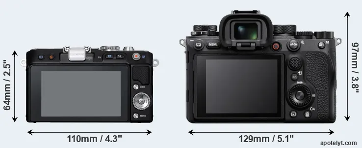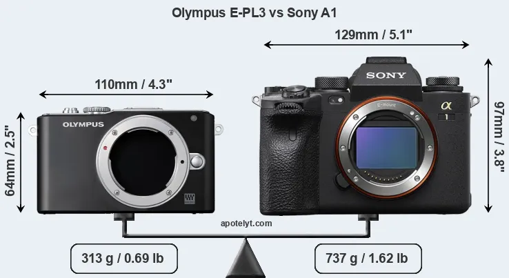 If the front view area (width x height) of the cameras is taken as an aggregate measure of their size, the Sony A1 is considerably larger (78 percent) than the Olympus E-PL3. Moreover, the A1 is substantially heavier (135 percent) than the E-PL3. It is noteworthy in this context that the A1 is splash and dust-proof, while the E-PL3 does not feature any corresponding weather-sealing.