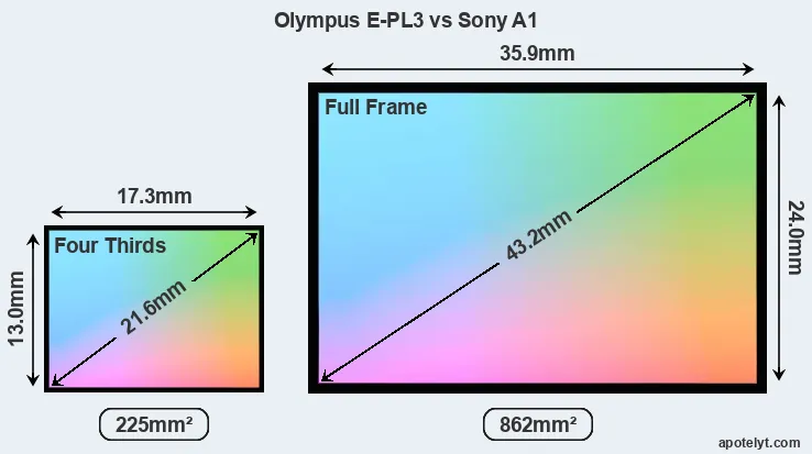 Of the two cameras under consideration, the Olympus E-PL3 features a Four Thirds sensor and the Sony A1 a full frame sensor. The sensor area in the A1 is 283 percent bigger. As a result of these sensor size differences, the cameras have a format factor of, respectively, 2.0 and 1.0. The sensor in the E-PL3 has a native 4:3 aspect ratio, while the one in the A1 offers a 3:2 aspect.