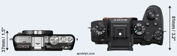 The side-by-side display below illustrates the physical size and weight of the Olympus E-PL3 and the Sony A1. The two cameras are presented according to their relative size. Three consecutive views from the front, the top, and the rear side are shown. All width, height and depth dimensions are rounded to the nearest millimeter.