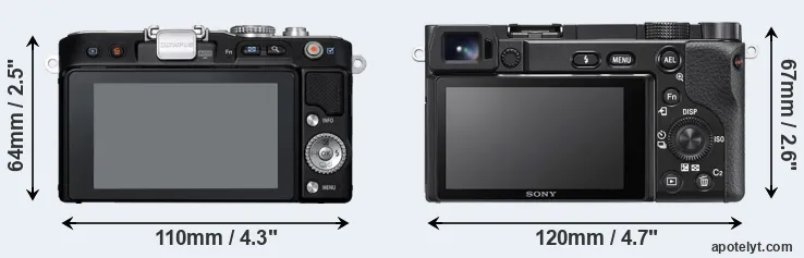The side-by-side display below illustrates the physical size and weight of the Olympus E-PL3 and the Sony A6100. The two cameras are presented according to their relative size. Three consecutive views from the front, the top, and the rear side are shown. All width, height and depth dimensions are rounded to the nearest millimeter.