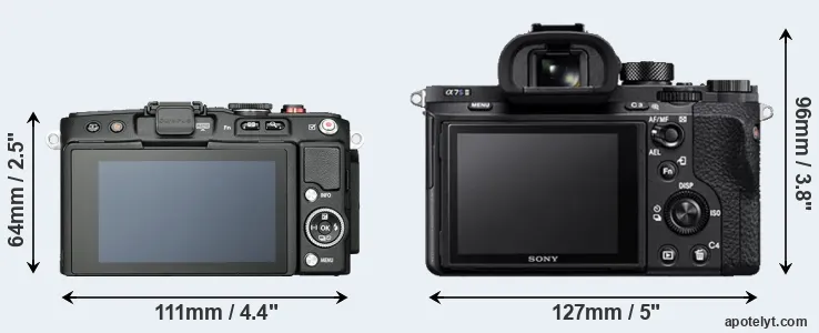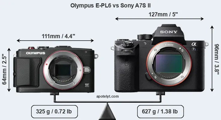 If the front view area (width x height) of the cameras is taken as an aggregate measure of their size, the Sony A7S II is considerably larger (72 percent) than the Olympus E-PL6. Moreover, the A7S II is substantially heavier (93 percent) than the E-PL6. It is noteworthy in this context that the A7S II is splash and dust-proof, while the E-PL6 does not feature any corresponding weather-sealing.