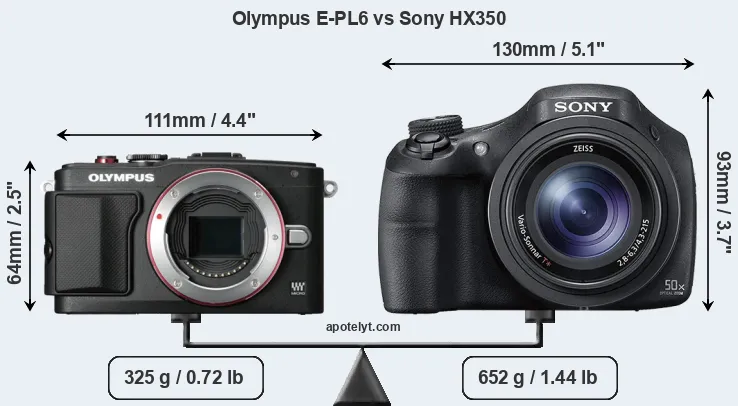The side-by-side display below illustrates the physical size and weight of the Olympus E-PL6 and the Sony HX350. The two cameras are presented according to their relative size. Three successive views from the front, the top, and the rear are shown. All width, height and depth measures are rounded to the nearest millimeter.