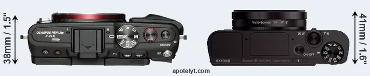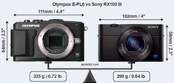 The side-by-side display below illustrates the physical size and weight of the Olympus E-PL6 and the Sony RX100 III. The two cameras are presented according to their relative size. Three consecutive views from the front, the top, and the rear side are shown. All width, height and depth dimensions are rounded to the nearest millimeter.