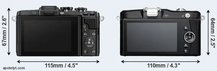 The physical size and weight of the Olympus E-PL7 and the Olympus E-PM1 are illustrated in the side-by-side display below. The two cameras are presented according to their relative size. Three consecutive views from the front, the top, and the rear side are shown. All width, height and depth dimensions are rounded to the nearest millimeter.