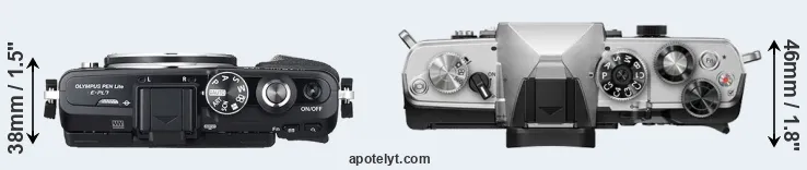 The side-by-side display below illustrates the physical size and weight of the Olympus E-PL7 and the OM System OM-3. The two cameras are presented according to their relative size. Three successive views from the front, the top, and the rear are shown. All size dimensions are rounded to the nearest millimeter.