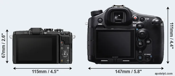 An illustration of the physical size and weight of the Olympus E-PL7 and the Sony A99 is provided in the side-by-side display below. The two cameras are presented according to their relative size. Three consecutive views from the front, the top, and the rear side are shown. All width, height and depth dimensions are rounded to the nearest millimeter.