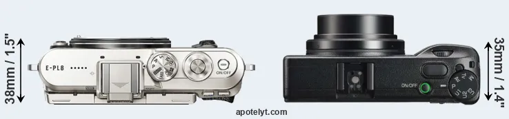 The above size and weight comparisons are to some extent incomplete and possibly misleading, as the GR IIIx has a lens built in, whereas the E-PL8 is an interchangeable lens camera that requires a separate lens. Attaching the latter will add extra weight and bulk to the setup. You can compare the optics available for the E-PL8 and their specifications in the Micro Four Thirds Lens Catalog.