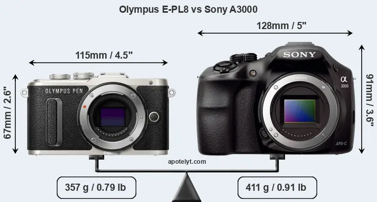 If the front view area (width x height) of the cameras is taken as an aggregate measure of their size, the Sony A3000 is considerably larger (51 percent) than the Olympus E-PL8. Moreover, the A3000 is markedly heavier (15 percent) than the E-PL8. In this context, it is worth noting that neither the E-PL8 nor the A3000 are weather-sealed.