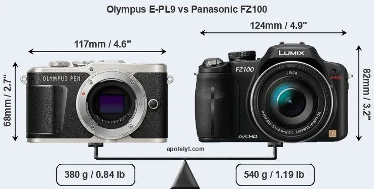 An illustration of the physical size and weight of the Olympus E-PL9 and the Panasonic FZ100 is provided in the side-by-side display below. The two cameras are presented according to their relative size. Three successive views from the front, the top, and the rear are shown. All size dimensions are rounded to the nearest millimeter.