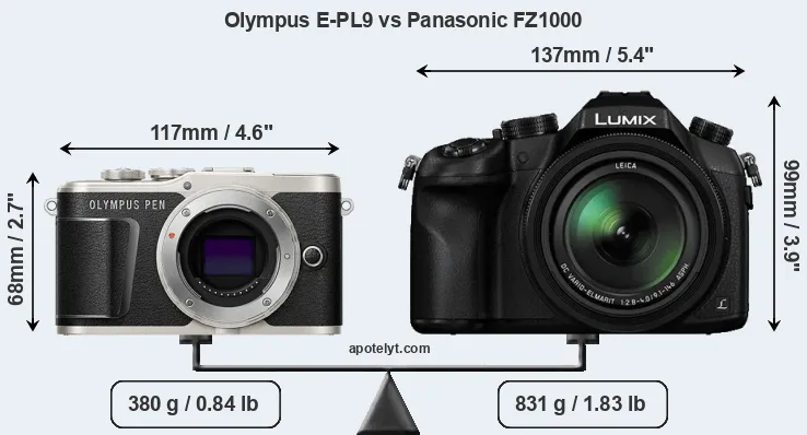 The physical size and weight of the Olympus E-PL9 and the Panasonic FZ1000 are illustrated in the side-by-side display below. The two cameras are presented according to their relative size. Three consecutive perspectives from the front, the top, and the back are available. All width, height and depth dimensions are rounded to the nearest millimeter.
