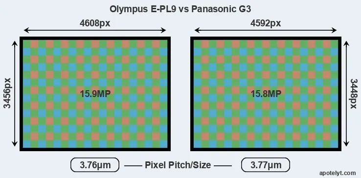 While the two cameras under review share the same sensor size, the E-PL9 offers a slightly higher resolution of 15.9 megapixels, compared with 15.8 MP of the G3. This megapixels advantage translates into a 0.3 percent gain in linear resolution. On the other hand, these sensor specs imply that the E-PL9 has a higher pixel density and a smaller size of the individual pixel (with a pixel pitch of 3.76μm versus 3.77μm for the G3). In this context, it should be noted, however, that the E-PL9 is much more recent (by 6 years and 8 months) than the G3, and its sensor will have benefitted from technological advances during this time that compensate for the smaller pixel size.