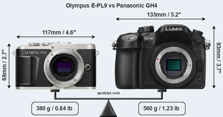 If the front view area (width x height) of the cameras is taken as an aggregate measure of their size, the Panasonic GH4 is considerably larger (55 percent) than the Olympus E-PL9. Moreover, the GH4 is substantially heavier (47 percent) than the E-PL9. It is noteworthy in this context that the GH4 is splash and dust-proof, while the E-PL9 does not feature any corresponding weather-sealing.