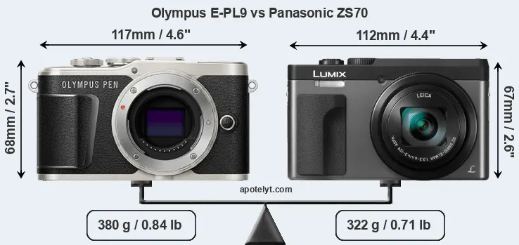 The side-by-side display below illustrates the physical size and weight of the Olympus E-PL9 and the Panasonic ZS70. The two cameras are presented according to their relative size. Three consecutive perspectives from the front, the top, and the back are available. All width, height and depth measures are rounded to the nearest millimeter.