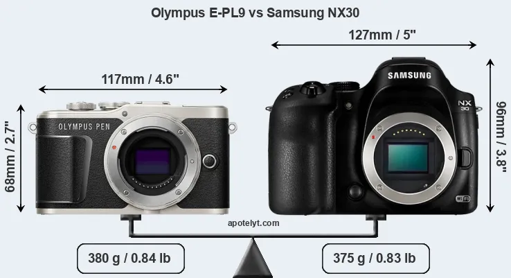 If the front view area (width x height) of the cameras is taken as an aggregate measure of their size, the Samsung NX30 is considerably larger (53 percent) than the Olympus E-PL9. However, the NX30 is slightly lighter (1 percent) than the E-PL9. In this context, it is worth noting that neither the E-PL9 nor the NX30 are weather-sealed.
