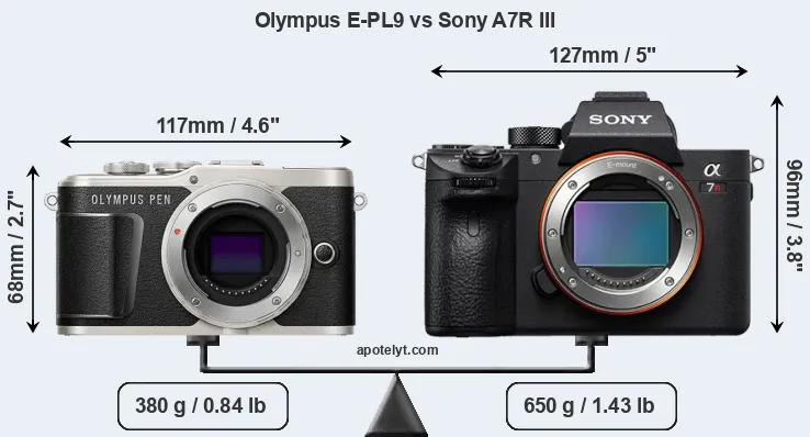 If the front view area (width x height) of the cameras is taken as an aggregate measure of their size, the Sony A7R III is considerably larger (53 percent) than the Olympus E-PL9. Moreover, the A7R III is substantially heavier (71 percent) than the E-PL9. It is noteworthy in this context that the A7R III is splash and dust-proof, while the E-PL9 does not feature any corresponding weather-sealing.