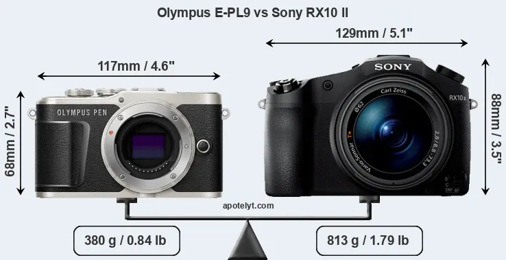 If the front view area (width x height) of the cameras is taken as an aggregate measure of their size, the Sony RX10 II is considerably larger (43 percent) than the Olympus E-PL9. It is noteworthy in this context that the RX10 II is splash and dust-proof, while the E-PL9 does not feature any corresponding weather-sealing.