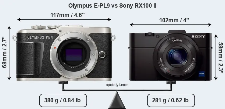 The above size and weight comparisons are to some extent incomplete and possibly misleading, as the RX100 II has a lens built in, whereas the E-PL9 is an interchangeable lens camera that requires a separate lens. Attaching the latter will add extra weight and bulk to the setup. You can compare the optics available for the E-PL9 and their specifications in the Micro Four Thirds Lens Catalog.