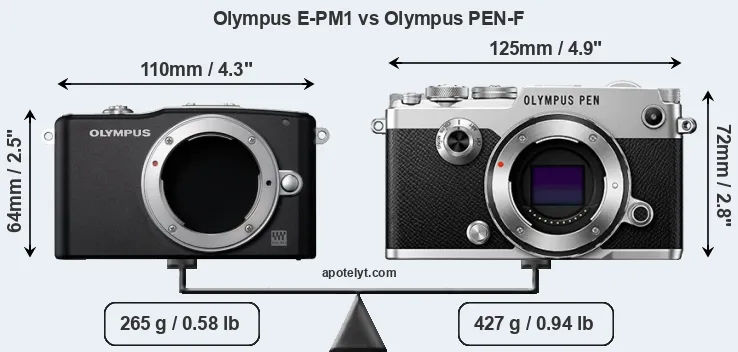 If the front view area (width x height) of the cameras is taken as an aggregate measure of their size, the Olympus PEN-F is notably larger (28 percent) than the Olympus E-PM1. Moreover, the PEN-F is substantially heavier (61 percent) than the E-PM1. In this context, it is worth noting that neither the E-PM1 nor the PEN-F are weather-sealed.