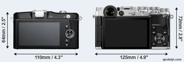 The side-by-side display below illustrates the physical size and weight of the Olympus E-PM1 and the Olympus PEN-F. The two cameras are presented according to their relative size. Three consecutive perspectives from the front, the top, and the back are available. All size dimensions are rounded to the nearest millimeter.