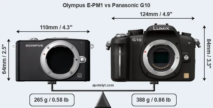 If the front view area (width x height) of the cameras is taken as an aggregate measure of their size, the Panasonic G10 is considerably larger (48 percent) than the Olympus E-PM1. Moreover, the G10 is substantially heavier (46 percent) than the E-PM1. In this context, it is worth noting that neither the E-PM1 nor the G10 are weather-sealed.