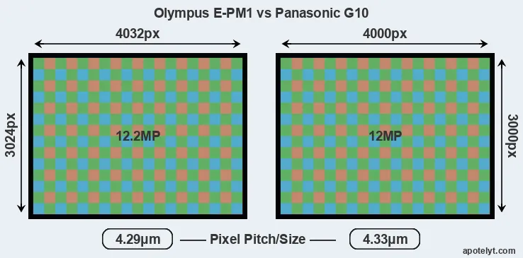 While the two cameras under review share the same sensor size, the E-PM1 offers a slightly higher resolution of 12.2 megapixels, compared with 12 MP of the G10. This megapixels advantage translates into a 0.8 percent gain in linear resolution. On the other hand, these sensor specs imply that the E-PM1 has a higher pixel density and a smaller size of the individual pixel (with a pixel pitch of 4.29μm versus 4.33μm for the G10). In this context, it should be noted, however, that the E-PM1 is a somewhat more recent model (by 1 year and 3 months) than the G10, and its sensor might have benefitted from technological advances during this time that at least partly compensate for the smaller pixel size.