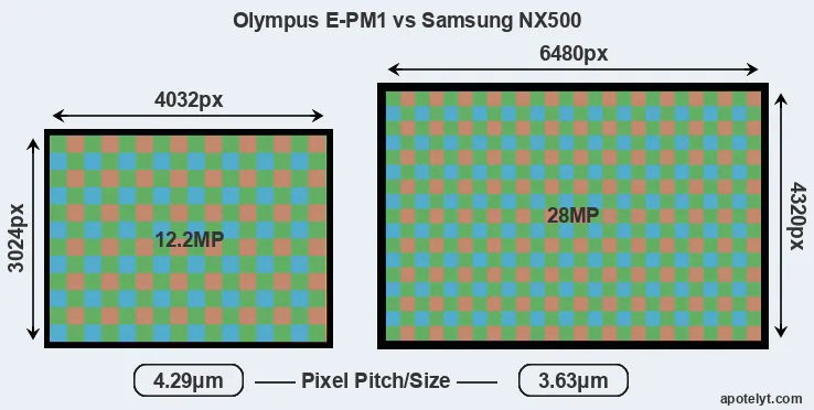 | Sensor Specs | Olympus E-PM1 | Samsung NX500 |