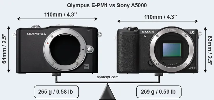 If the front view area (width x height) of the cameras is taken as an aggregate measure of their size, the Sony A5000 is somewhat smaller (2 percent) than the Olympus E-PM1. However, the A5000 is slightly heavier (2 percent) than the E-PM1. In this context, it is worth noting that neither the E-PM1 nor the A5000 are weather-sealed.