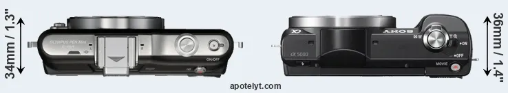 The physical size and weight of the Olympus E-PM1 and the Sony A5000 are illustrated in the side-by-side display below. The two cameras are presented according to their relative size. Three successive views from the front, the top, and the rear are shown. All width, height and depth measures are rounded to the nearest millimeter.