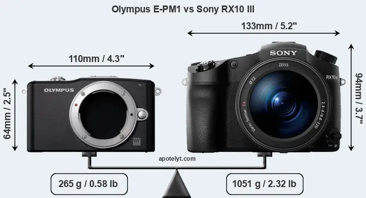 The physical size and weight of the Olympus E-PM1 and the Sony RX10 III are illustrated in the side-by-side display below. The two cameras are presented according to their relative size. Three successive views from the front, the top, and the rear are shown. All width, height and depth dimensions are rounded to the nearest millimeter.