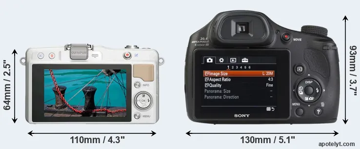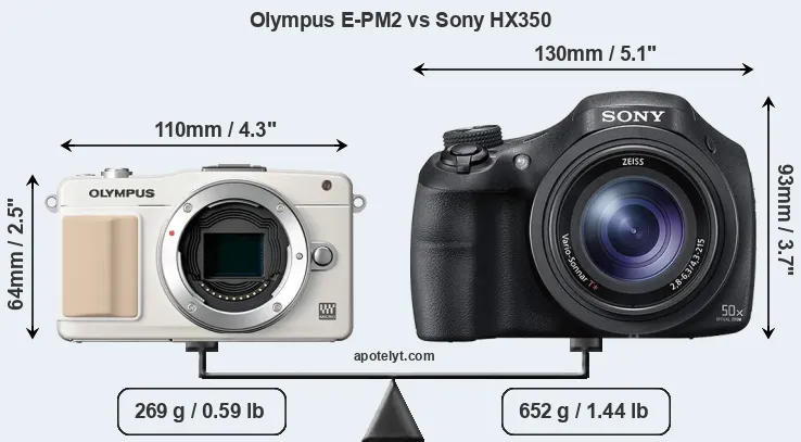 The side-by-side display below illustrates the physical size and weight of the Olympus E-PM2 and the Sony HX350. The two cameras are presented according to their relative size. Three consecutive perspectives from the front, the top, and the back are available. All size dimensions are rounded to the nearest millimeter.