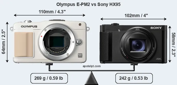 The side-by-side display below illustrates the physical size and weight of the Olympus E-PM2 and the Sony HX95. The two cameras are presented according to their relative size. Three consecutive perspectives from the front, the top, and the back are available. All size dimensions are rounded to the nearest millimeter.
