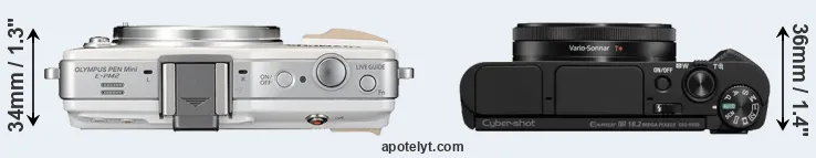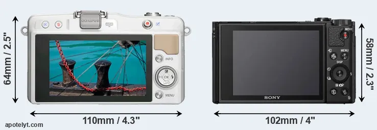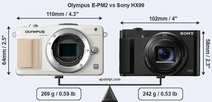 The side-by-side display below illustrates the physical size and weight of the Olympus E-PM2 and the Sony HX99. The two cameras are presented according to their relative size. Three consecutive perspectives from the front, the top, and the back are available. All size dimensions are rounded to the nearest millimeter.