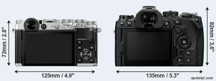 The side-by-side display below illustrates the physical size and weight of the Olympus PEN-F and the OM System OM-1. The two cameras are presented according to their relative size. Three consecutive perspectives from the front, the top, and the back are available. All width, height and depth measures are rounded to the nearest millimeter.