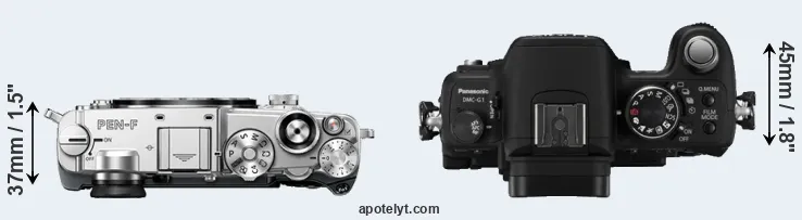 If the front view area (width x height) of the cameras is taken as an aggregate measure of their size, the Panasonic G1 is notably larger (16 percent) than the Olympus PEN-F. However, the G1 is markedly lighter (16 percent) than the PEN-F. In this context, it is worth noting that neither the PEN-F nor the G1 are weather-sealed.