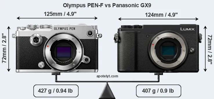 An illustration of the physical size and weight of the Olympus PEN-F and the Panasonic GX9 is provided in the side-by-side display below. The two cameras are presented according to their relative size. Three successive views from the front, the top, and the rear are shown. All width, height and depth measures are rounded to the nearest millimeter.