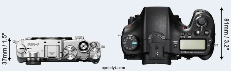 An illustration of the physical size and weight of the Olympus PEN-F and the Sony A77 is provided in the side-by-side display below. The two cameras are presented according to their relative size. Three consecutive views from the front, the top, and the rear side are shown. All width, height and depth measures are rounded to the nearest millimeter.