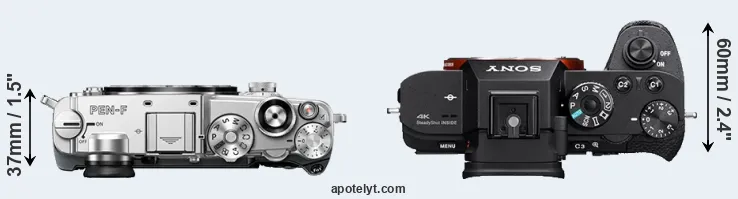 The physical size and weight of the Olympus PEN-F and the Sony A7S II are illustrated in the side-by-side display below. The two cameras are presented according to their relative size. Three consecutive perspectives from the front, the top, and the back are available. All width, height and depth dimensions are rounded to the nearest millimeter.