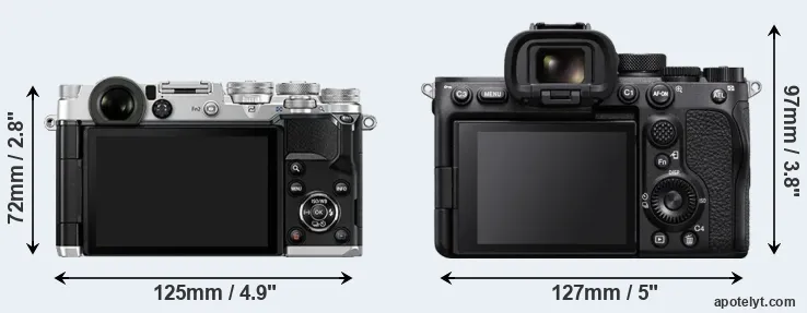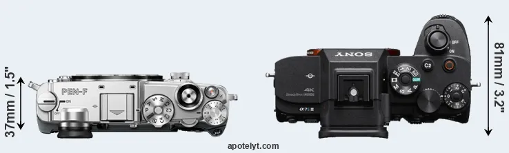 The side-by-side display below illustrates the physical size and weight of the Olympus PEN-F and the Sony A7S III. The two cameras are presented according to their relative size. Three consecutive views from the front, the top, and the rear side are shown. All width, height and depth dimensions are rounded to the nearest millimeter.
