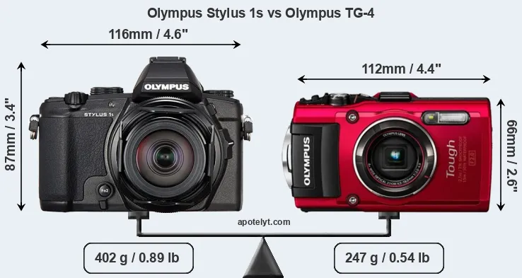 If the front view area (width x height) of the cameras is taken as an aggregate measure of their size, the Olympus TG-4 is notably smaller (27 percent) than the Olympus Stylus 1s. Moreover, the TG-4 is substantially lighter (39 percent) than the Stylus 1s. It is noteworthy in this context that the TG-4 is splash and dust-proof, while the Stylus 1s does not feature any corresponding weather-sealing. More than that, the TG-4 is water-proof up to 15m and can, thus, be used for underwater photography.