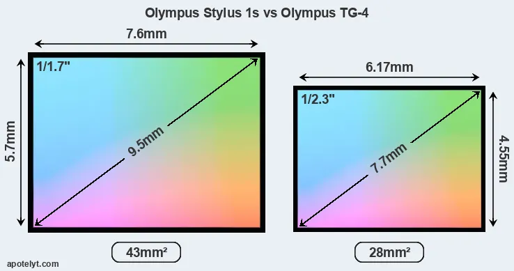 Of the two cameras under consideration, the Olympus Stylus 1s features a 1/1.7-inch sensor and the Olympus TG-4 a 1/2.3-inch sensor. The sensor area in the TG-4 is 35 percent smaller. As a result of these sensor size differences, the cameras have a format factor of, respectively, 4.5 and 5.6. Both cameras feature a native aspect ratio (sensor width to sensor height) of 4:3.