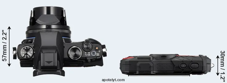 The physical size and weight of the Olympus Stylus 1s and the Ricoh WG-60 are illustrated in the side-by-side display below. The two cameras are presented according to their relative size. Three consecutive perspectives from the front, the top, and the back are available. All size dimensions are rounded to the nearest millimeter.