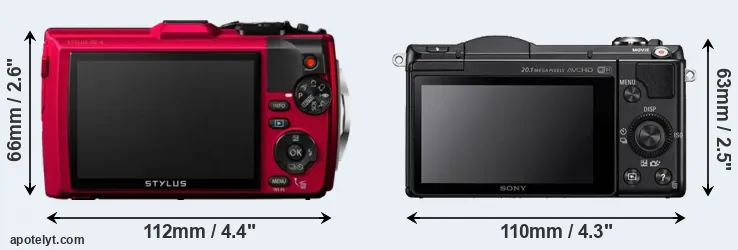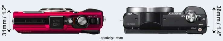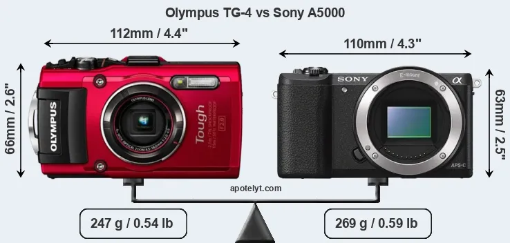 The side-by-side display below illustrates the physical size and weight of the Olympus TG-4 and the Sony A5000. The two cameras are presented according to their relative size. Three successive views from the front, the top, and the rear are shown. All width, height and depth dimensions are rounded to the nearest millimeter.